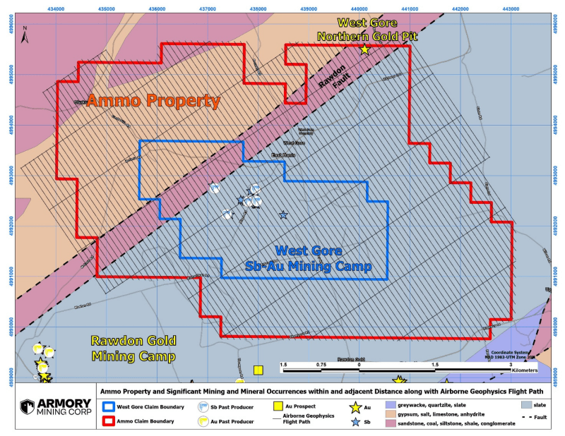 The Company has the option to acquire a 100% interest in the Ammo Sb-Au project, comprising three contiguous mineral claims (Exploration Licenses) surrounding the historical West Gore antimony-gold mine, a past producer of antimony and gold, located in central Nova Scotia, Canada covering approximately 3,020 hectares (Fig. 2).